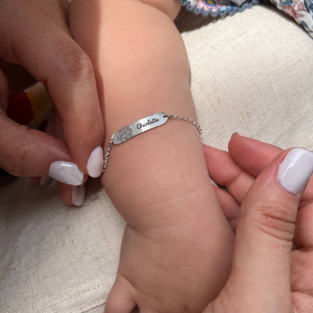 This baby bracelet can be customized with the baby's name and the birth flower pattern that symbolizes the month of his or her birthday. It is exquisite and beautiful. The bracelet is available in three colors: gold, silver and rose gold. It is suitable for daily wear and for special occasions such as birthday parties and full moon banquets.