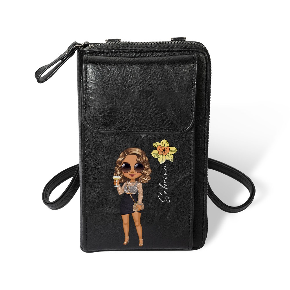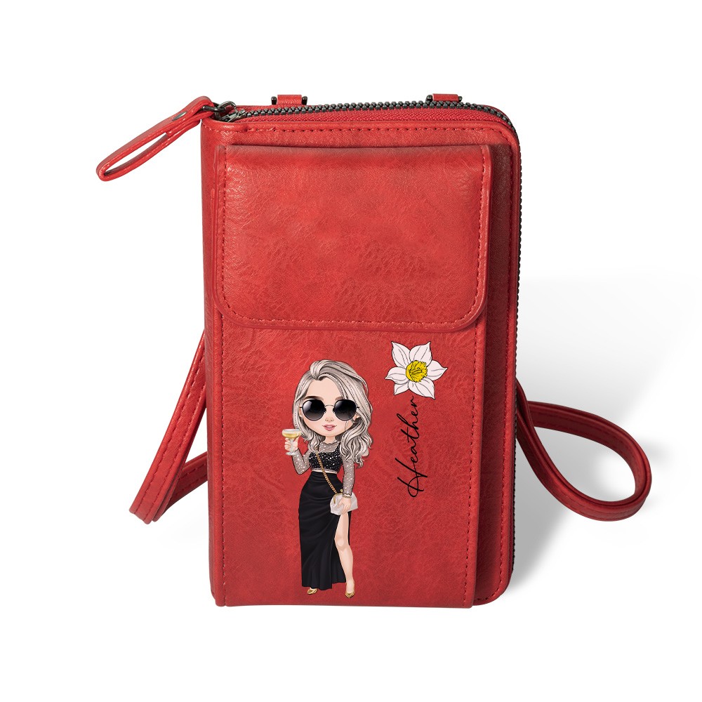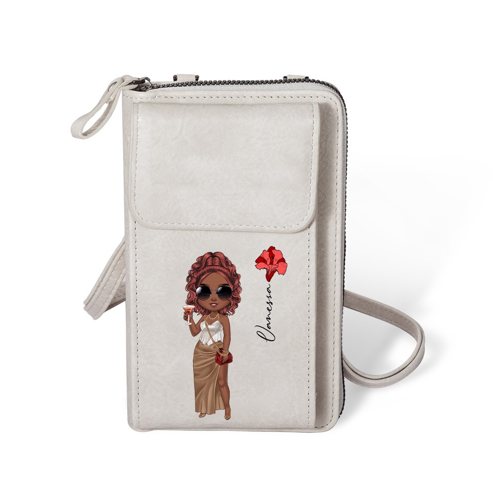 Personalized Fashion Girl Mobile Phone Wallet with Birth Flower & Name, Retro Leather Crossbody Bag, Birthday/Christmas Gift for Mom/Wife/Girlfriend