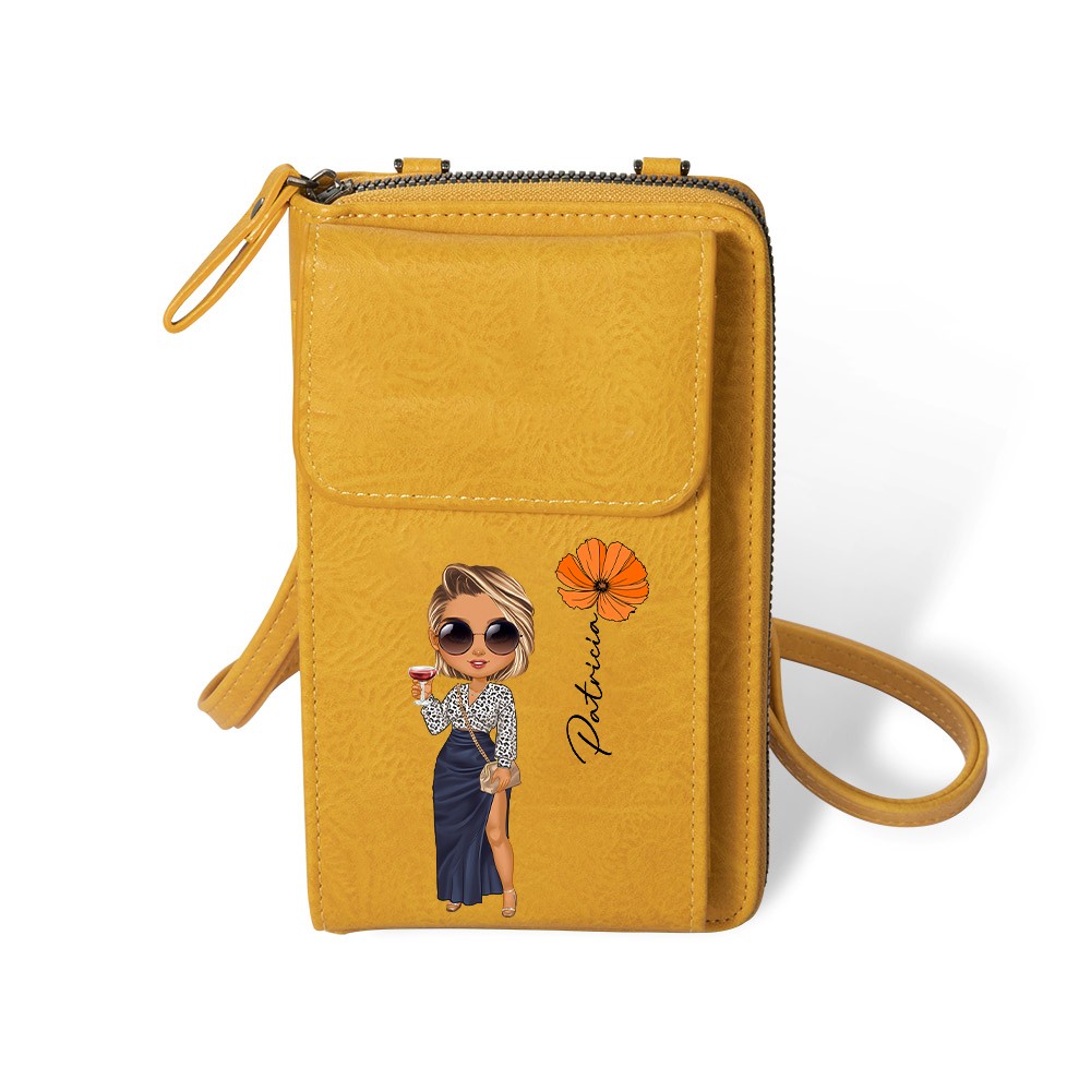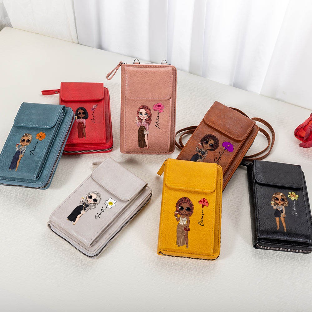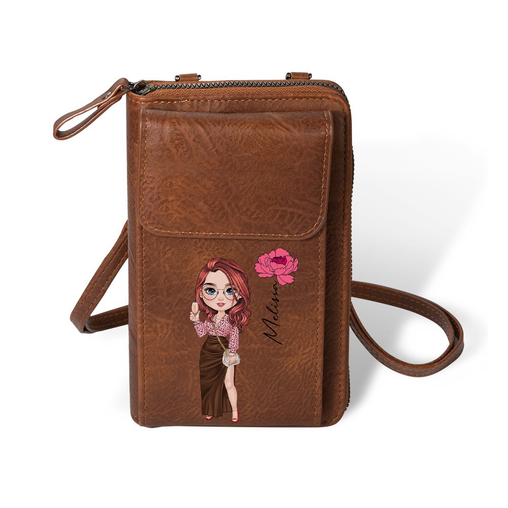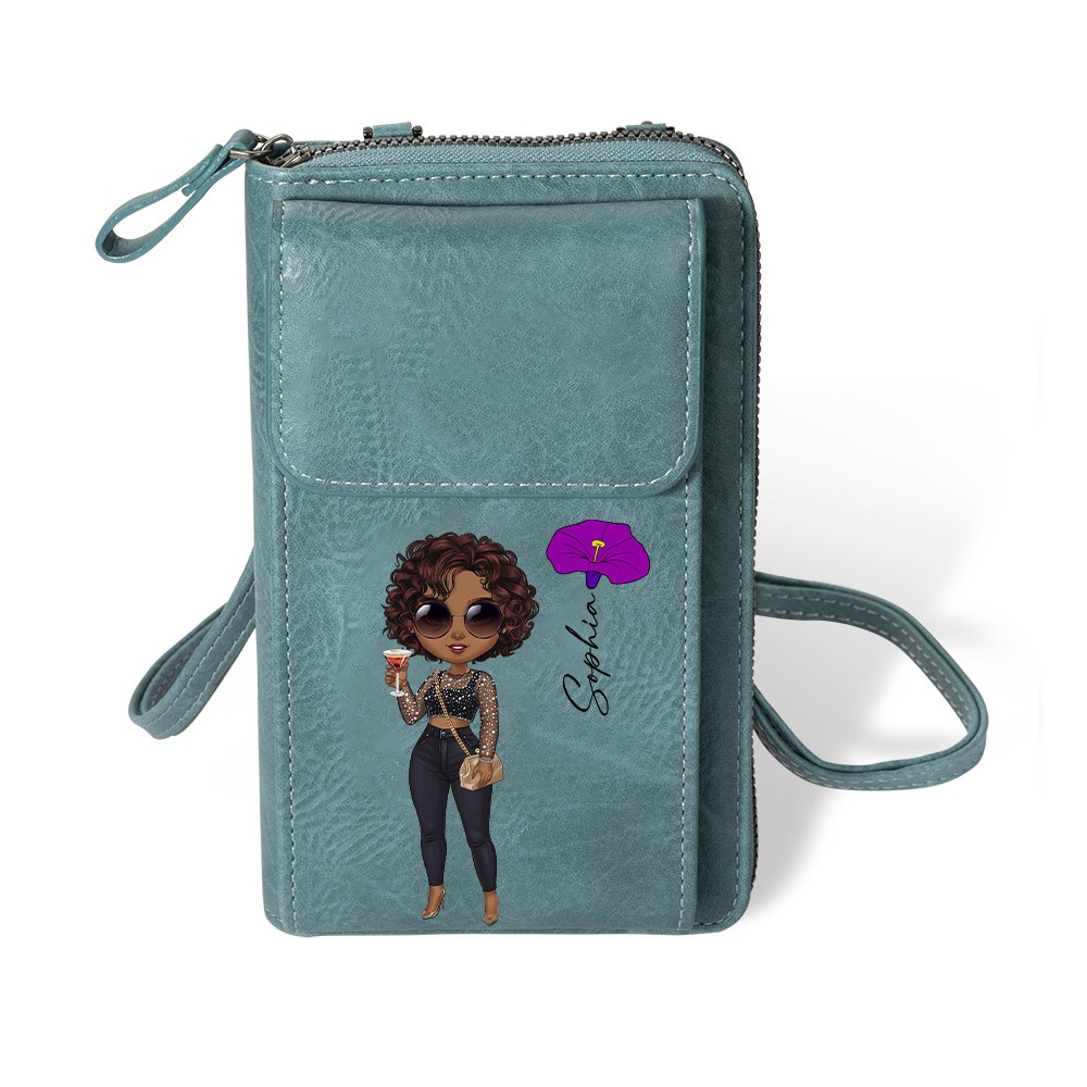 Personalized Fashion Girl Mobile Phone Wallet with Birth Flower & Name, Retro Leather Crossbody Bag, Birthday/Christmas Gift for Mom/Wife/Girlfriend